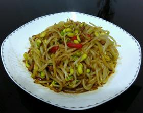 黄豆芽去根洗净,肉丝洗净,红椒洗净切丝