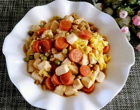 豌豆可以用新鲜的颜色更绿,烤肠换用火腿肠替代亦可,豆腐最好是嫩豆腐,亦或日本豆腐口感好。