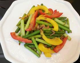 再加入红.黄椒.入少许盐.鸡粉翻炒2-3分钟