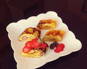 - 5. 蛋糊凝固成形后,轻轻向一侧卷起,再舀一勺蛋糊放入锅中,这层就不需要放草莓片了,蛋糊成型后,以原有卷好的蛋卷为基础向另一侧卷起,再第3次舀入蛋糊至锅中,蛋糊成型后向另一侧再卷起。关火。