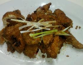 将油至8成热下鸡块炸脆,炸酥。捞起切块装盘撒上椒盐粉
