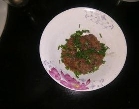 盛出肉饼,撒上葱花。再放油,油滚后,淋到肉饼上。