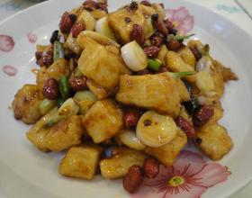 - 4. 倒入汁子翻炒,放入葱白段,出锅前淋少许水淀粉,倒入炸好的花生米,淋少许辣椒油,出锅。