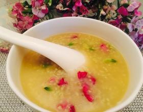小火煮一分钟!待槐花和玫瑰花的香味融入小米粥时!关火!