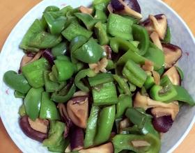 待蒜香味出来后,将香菇放入锅中,并加入蚝油开始翻炒,大约两份钟后,倒入青椒,一块儿开始翻炒.