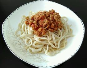 面条用盘子装出,浇上番茄肉末拌匀即可享用