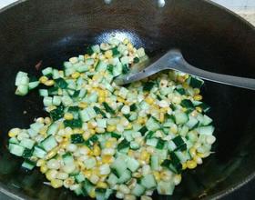 将糯玉米炒到八成熟再加入黄瓜一起炒,颜色搭配还不错。