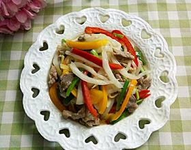 再加入彩椒,加适量盐,再加入葱段,翻炒两下就可以出锅了。