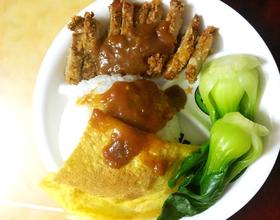 - 4. 放入足量的油烧开,放入猪里脊,小火炸熟至金黄色捞出沥干油,切条,顺便用剩下的蛋液煎个鸡蛋皮,烫两棵青菜,装盘淋上酱汁即可!