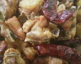 将鸡炸至金黄,加入干辣椒、大蒜、花椒籽翻炒一下,调入味精、生抽拌匀即可。