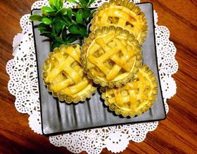 - 11. 提前175度预热烤箱,交叉铺好在放了馅的挞上,然后刷上一层蛋液