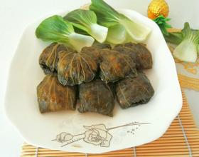 如图酸菜叶切正方形状放入调好的酸菜肉馅再包正方形状