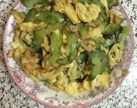 热锅放油炒苦瓜,炒到七成熟放盐,倒入煎好的鸡蛋翻炒,放适量盐炒匀起锅