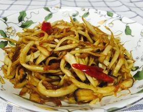 当杏鲍菇中的水分大部分出来,并且杏鲍菇开始有些金黄,锅里也没什么水分的时候,放入辣椒段,继续翻炒一会