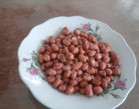 锅内加油,烧到七成油温加花生米,小火翻炒