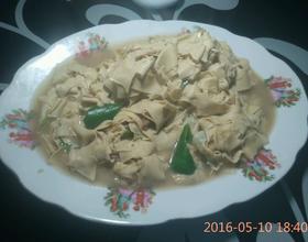 炖煮五分钟,入味后,加入尖椒,翻炒一会,加入水淀粉勾芡,点点味精,香油出锅。