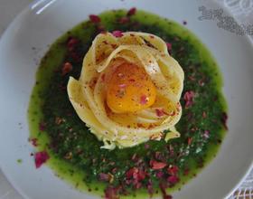将面条卷起来,像鸟巢似地放入咖啡杯。  - 9. 鸡蛋分离。注意蛋黄要保持完整。每个杯子里加入一个打散了的蛋白。上笼滚水蒸15分钟,直到蛋白凝固。
