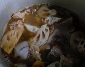 锅内放油,依次放入辣椒,八角,姜,蒜,香叶,小茴香,蕃茄酱翻炒,出香味,放排骨,放藕炒。