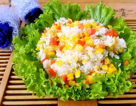 翻炒均匀,再倒入玉米粒、青椒和胡萝卜