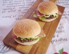 - 12. 汉堡胚对半切开,放入牛肉饼、生菜、火腿片,挤上沙拉酱,再盖上另一片汉堡胚,完成!