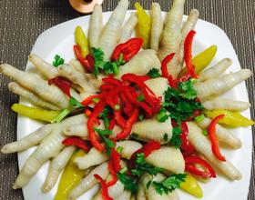 经过冷藏后的鸡爪,摆盘,添加红椒丝