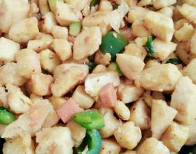 翻炒一分钟后,这样香喷喷的五彩鸡蛋馒头丁就出锅了