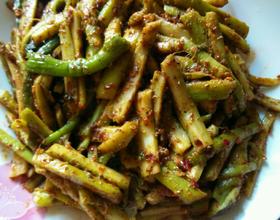 芋头芽炒软后,放入辣椒面,花椒面,炒出香味,放入盐,味精翻炒一下。