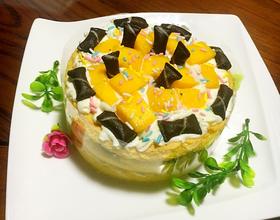 第三层挤奶油铺芒果,放上奥利奥蝴蝶结饼干,撒上巧克力彩色针装饰