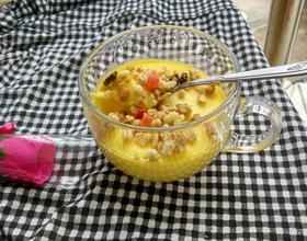 融化好的牛奶放入鸡蛋中,再加入打碎了的燕麦,再搅拌均匀