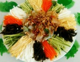 将白菜,黄瓜、胡萝卜,香菜洗净。木耳摘净用沸水烫一下,大蒜去皮,猪里脊切丝加酱油,水淀粉抓匀腌制10分钟。