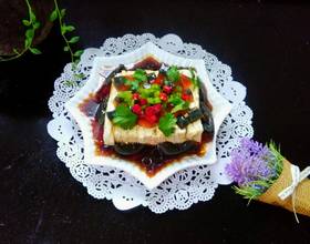 松花蛋切成丁状和块状摆放在豆腐上面和两边