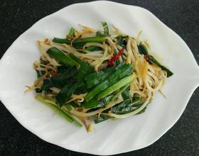 炒至韭菜豆芽断生,加入盐,味精,耗油