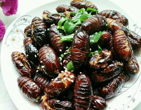 蚕蛹用水煮时,捞出来空干净水分蚕蛹用剪刀处理完放淀粉是为了吸取多余水分,在油锅里好炸!!蚕蛹在油锅炸时,小火慢炸,用筷子搅匀下,小心粘锅!!最后爆炒时,可以根据个人口味,也可以加入孜然粉!!