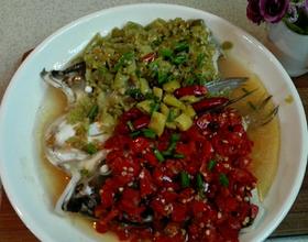 放上鱼头并把红绿剁椒分开平铺鱼头两边