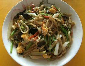 将拉条子倒入锅中翻炒,再放适量的盐,淋少许生抽,再加些许耗油,少许花椒水,翻炒均匀,最后把鸡蛋倒入颠翻均匀,出锅,装盘。