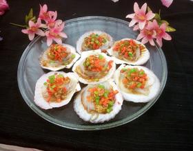 把炸好蒜茸放在扇贝肉上。入锅蒸10分钟。