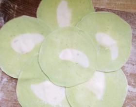白色的面团搓成长条状,绿色的面团幹成长面皮,用绿色的面包住白面条