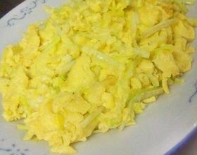 炒锅倒入少油烧热,转文火,倒入搅好的蛋液,再加入控好水的韭黄。
