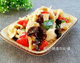 - 4. 木耳用清水泡发、洗净;青红椒洗净切片;葱姜蒜切下图样