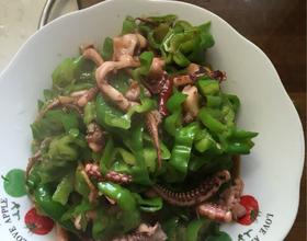 锅烧热,加入菜籽油,烧热油,放入鱿鱼丝,然后加入生姜丝,干红辣椒,再加入少许盐爆炒。炒两分钟加入一勺水,以便鱿鱼熟透