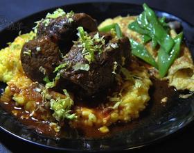 - 9. 牛肉不加盖30分钟。沙锅煲的牛腿已经脱骨,去骨装盘;烤箱出来的牛肉还是整块的,整块装盘。煮牛肉的汤汁再次煮开,有需要的话再收水,加盐和胡椒调味,淋在肉上。撒上欧芹叶和刨成丝的柠檬皮,即可。