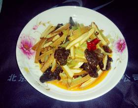 木耳豆干一定要先下锅,最后在放入芹菜,因为芹菜很嫩,炒两分钟就可以出锅。
