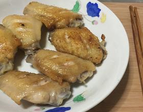 鸡翅膀两面都焦黄后,摇动一下锅子,关火,盖上锅盖,好让鸡翅膀熟透。由于鸡翅膀已经腌制过,所以直接上菜就可以。