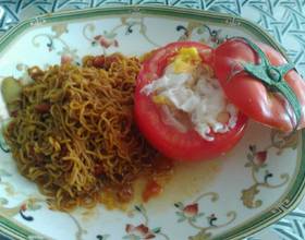 把西红柿掏空放鸡蛋汤用、里面的汁拿来煮面