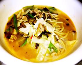 一开始炒料头的时候火可以稍微小点儿,防止炒焦。有条件的可以在加水的同时加点高汤调味。我这是改良版的片儿川,老底子的片儿川只有雪菜、笋、和肉丝,没有豆瓣酱,大家做的时候也可以根据自己的口味增减料头和调味品。
