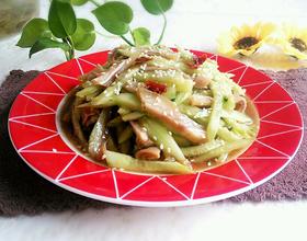 黄瓜丝和猪耳朵丝放入盆里。将蒜汁倒入