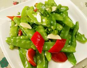 荷兰豆去头尾去筋洗净 蒜切片 葱切小段 红辣椒切菱形块