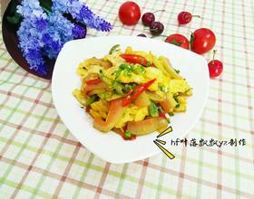 炒至西瓜皮断生,放入先前煎好的鸡蛋翻炒均匀(注:鸡蛋无需再放盐)
