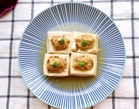把拌好的肉末塞入豆腐里面,上面放一颗青豆。