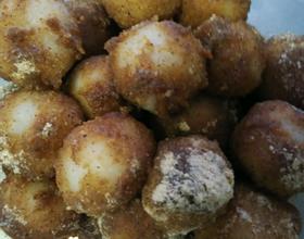 用漏勺捞起煮熟的汤圆,倒在豆面碗中,不停滚动,使汤圆上滚满豆面